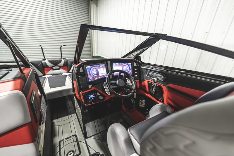 All our Centurion 2024 Ri models have the Revo Side by Side 12” x 12” Touch Vision HD Dash, which has graphical control over nearly every boat system. You could call it the brains of the boat. It offers an Inspection Mode to toggle-off Auto Drain for ease of inspection at Aquatic Invasive Species (AIS) checkpoints. It can easily control the optional QuickSurf Pro, as many as seven independent ballast areas including RAMFILL², all lighting functionality, including optional RGB control, Wet Sounds Stereo volume control and even GPS mapping. The right screen display changes with these menu options, while the left display remains constant with instant access to ZeroOff speed control, engine RPM, the ROV’s bow and stern cameras plus real time trip and fuel data.